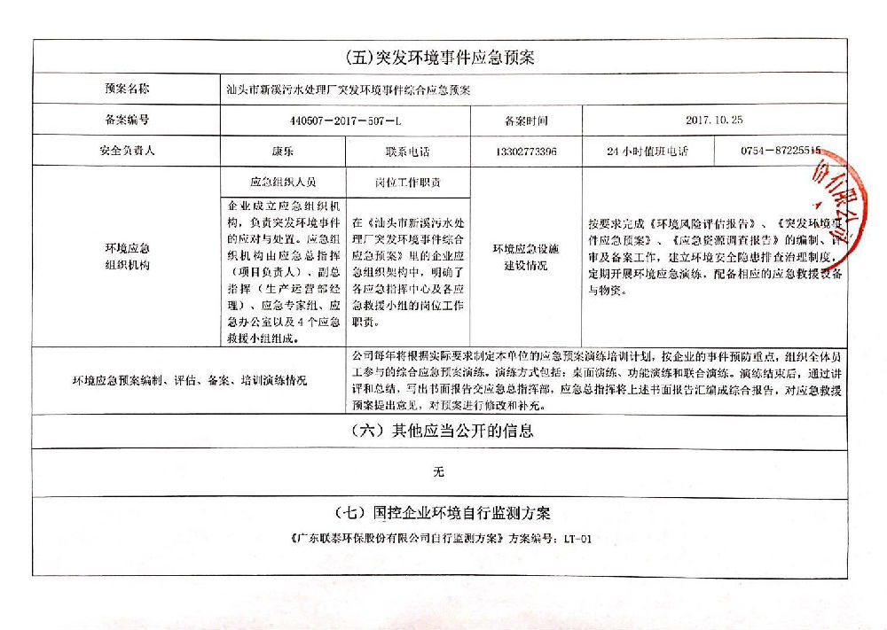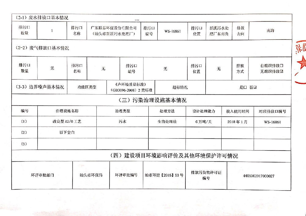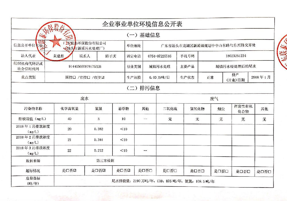 企業(yè)事業(yè)單位環(huán)境信息公開表(新溪污水處理廠)發(fā)布時間:2018-04-20