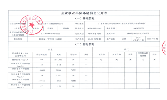企業事業單位環境信息公開表(龍珠水質凈化廠17年12月-18年5月)